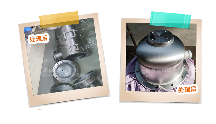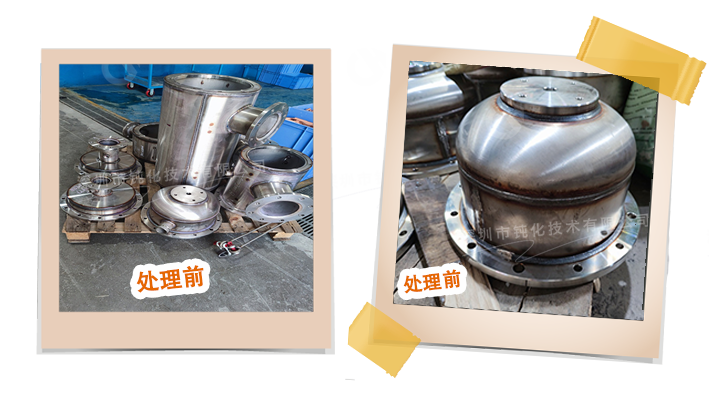 可以直觀的看出外觀氧化非常嚴重,尤其焊接焊縫部位,客戶周周轉轉找了很多供應商,一直解決不了這個問題,不是氧化除不干凈,就是焊接部位處理之后還是黑的,要么就是鹽霧藍點過不去,冥冥之中就找到了我,經過電話溝通兩人相談甚歡,像熱戀期的情侶一樣熱情似火,好了,咱們過多的就不說了,直接看酸洗鈍化之后的效果圖吧!