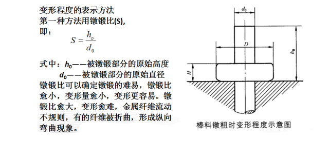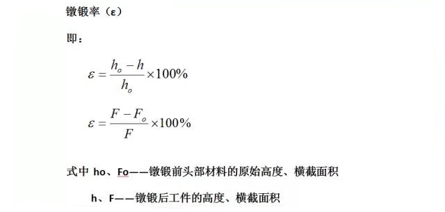 1、變形程度:是指坯料被鐓鍛部分長度在鐓鍛終了的壓縮量與原始高度的比值,或者坯料截面積在鐓鍛終了截面積的增加量與原始橫截面的比值