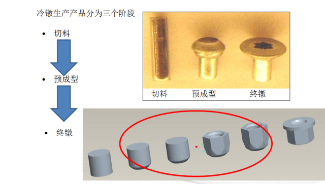 冷鐓(冷擠):金屬在常溫下,借助模具進行鐓鍛完成金屬塑性變形,達到規定的幾何形狀、尺寸及質量要求的工藝方法。