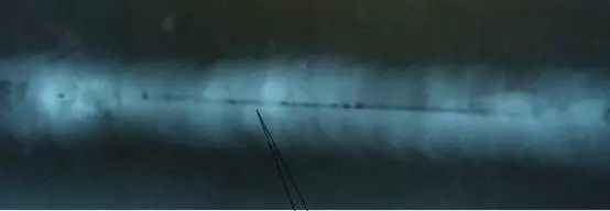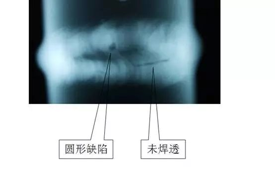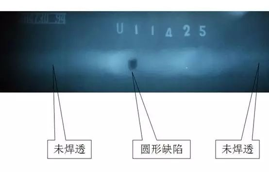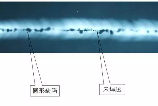 上圖所示,從圖中可以很清楚的看到焊縫中心有許多圓形缺陷(圓形氣孔),再仔細的可以看到有一條位于焊縫中心的黑直線將圓形缺陷串聯起來,黑直線即為未焊透影像。