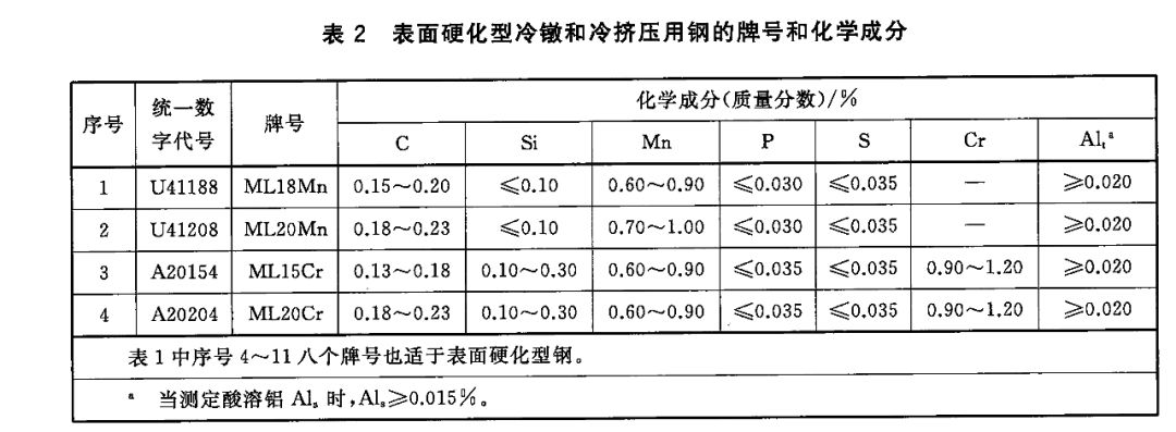 2)表面硬化型冷鐓和冷擠壓用鋼的牌號和化學成分(熔煉分析)應符合以下表格的規定。