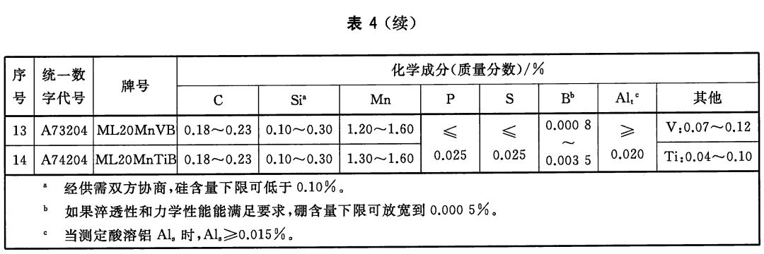 3)調質型冷鐓和冷擠壓用鋼(包括含硼鋼)的牌號和化學成分(熔煉分析)應符合表3和表4的規定。
