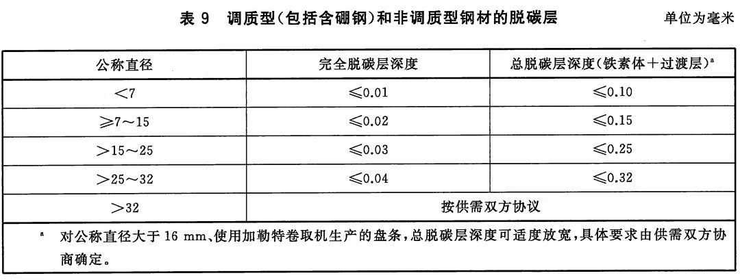 3)調質型(包括含硼鋼)和非調質型鋼材應進行脫碳層檢驗。脫碳深度應符合下表規定要求。