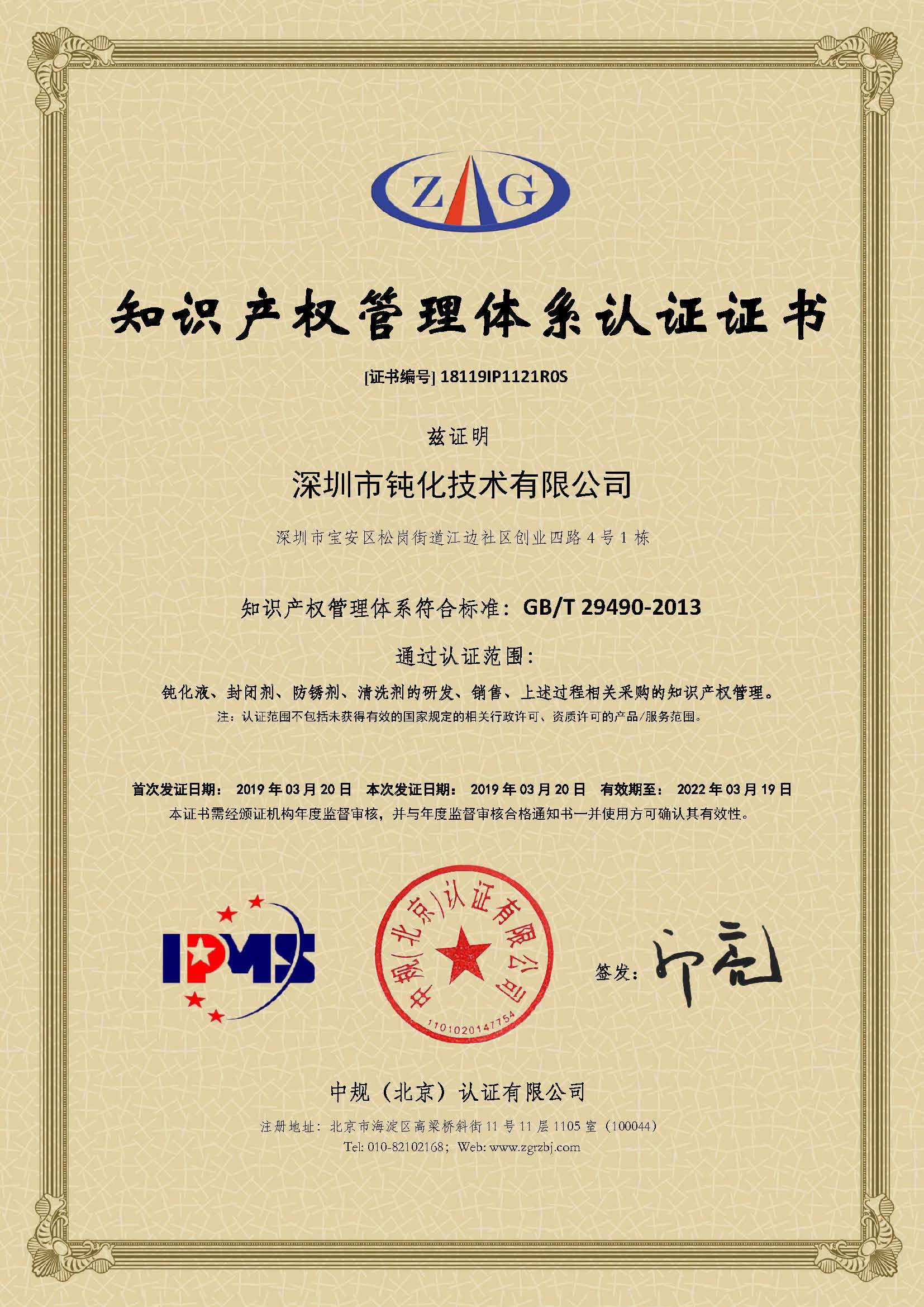 深圳市鈍化技術(shù)有限公司近日通過(guò)鈍化人的協(xié)作與努力,順利通過(guò)了知識(shí)產(chǎn)權(quán)管理體系認(rèn)證,并收到中規(guī)(北京)認(rèn)證有限公司頒發(fā)的《知識(shí)產(chǎn)權(quán)管理體系認(rèn)證證書(shū)》,認(rèn)證鈍化技術(shù)知識(shí)產(chǎn)權(quán)管理體系符合標(biāo)準(zhǔn):GB/T 29490-2013,發(fā)證日期2019年03月20日。通過(guò)認(rèn)證范圍為鈍化液、封閉劑、防銹劑、清洗劑的研發(fā)、銷(xiāo)售,上述過(guò)程相關(guān)采購(gòu)的知識(shí)產(chǎn)權(quán)管理。