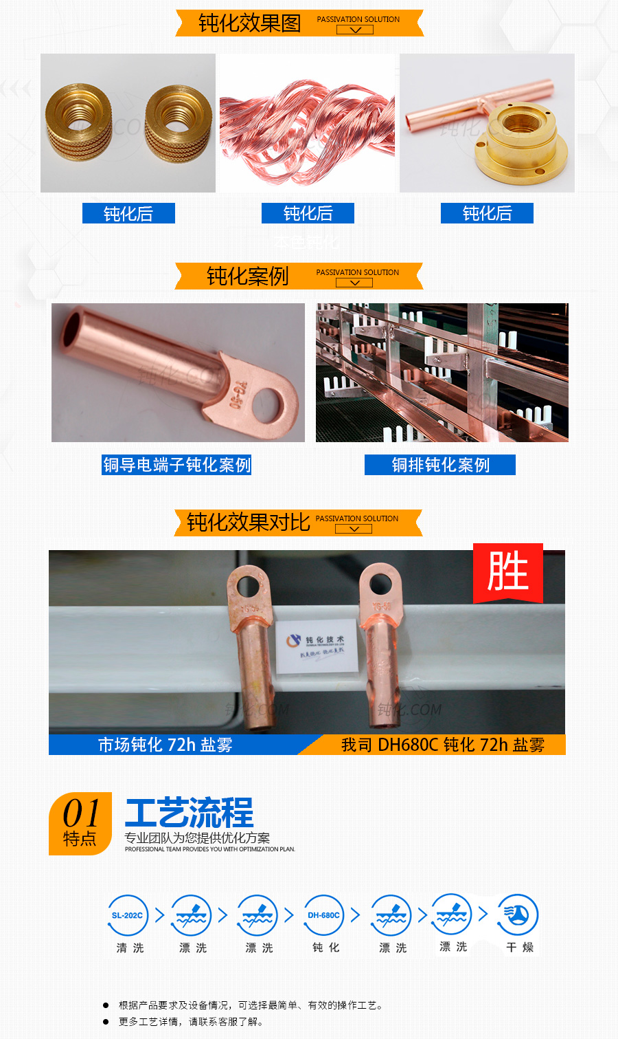DunHua680C 使用建議 操作方式 浸沒 使用濃度 10% Vol(5~15% Vol) 處理溫度 15~40℃ 處理時間 5min(1~10min) 適用范圍 銅材、鍍銅產品的鈍化處理,可提升抗氧化、防變色性能