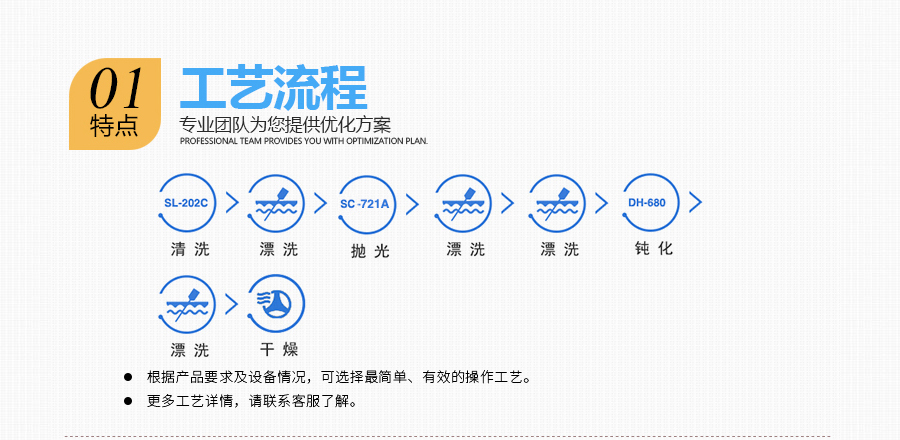 SanCy 721A 使用建議 使用濃度 100% Vol 處理時間 30~240s 處理溫度 常溫 操作方式 浸沒 適用范圍 紫銅及H60以上化學(xué)拋光