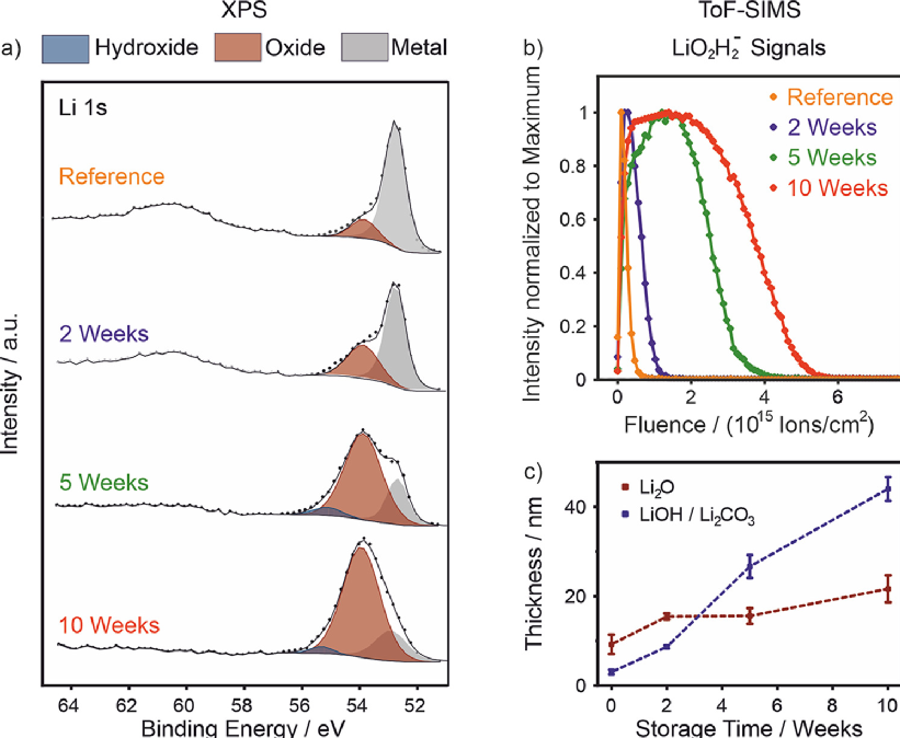 圖 1、使用(a)XPS濺射后(1 kV濺射3分鐘、2 kV 8分鐘和4 kV濺射30分鐘),在手套箱密閉塑料盒中存放1到10周的鋰箔表面分析結果,和(b)ToF-SIMS深度分析結果。(c)鈍化層厚度隨存儲時間的變化。
