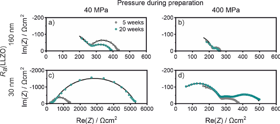圖3a顯示,不同存儲時間下的阻抗沒有顯著差異。將壓力增加到400 MPa(圖3b)甚至消除了之前存在的微小差異,表明所施加的壓力具有很強的影響。在較低粗糙度和40 MPa的壓力下,較厚的鈍化層具有更高的界面電阻。在較高的壓力下,差異也很明顯。這表明較低粗糙度下,鋰箔無法通過變形使鈍化層破裂,改善界面接觸,因此鈍化層厚度對界面阻抗的影響較大(圖4)。實驗表明,SE的粗糙度和施加壓力對與LLZO接觸的鋰金屬箔界面電阻起著重要作用。