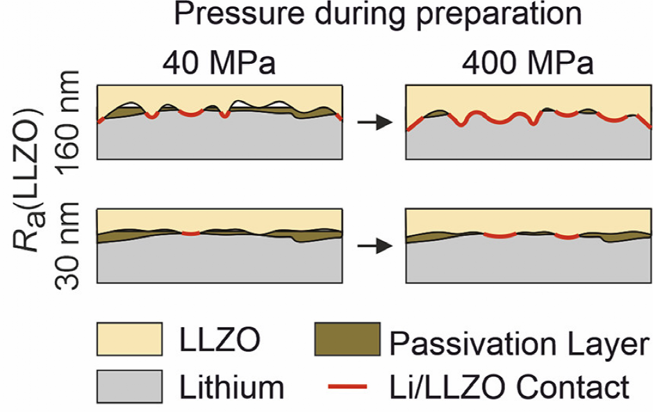 圖 4、用不同的LLZO顆粒粗糙度和壓力測量的Li|LLZO界面示意圖。