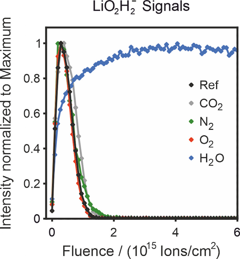 圖 5、暴露于干燥N2、O2和CO2以及含H2O的Ar中22小時的鋰箔ToF-SIMS深度分布圖。
