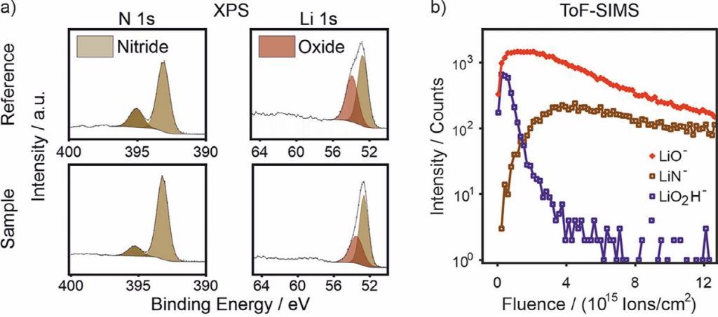 ToF-SIMS深度分布如圖6b所示,近表面區域不包含Li3N,因為開始的LiN–信號強度非常低,而氧化物的強度和氫氧化物相關信號占主導地位。隨著濺射時間的延長,LiN–強度會增加并變得幾乎恒定,表明樣品完全轉化為Li3N。完全轉化表明鋰和氮的反應在手套箱氣氛下不是自限性的。因此,Li3N很可能不會形成覆蓋層。