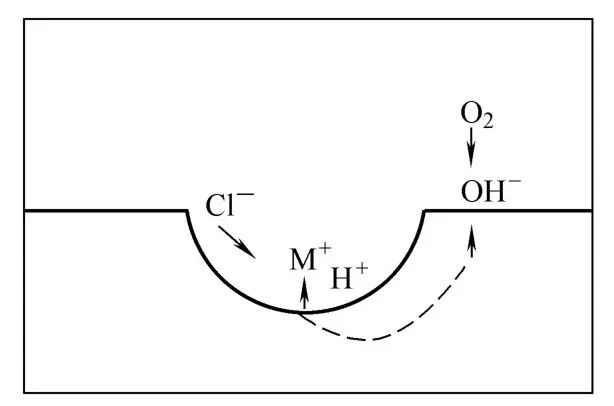 已形成的蝕孔隨著腐蝕的繼續(xù)進(jìn)行。小孔內(nèi)積累了過量的正電荷,引起外部Cl-的遷入以保持電中性,繼之孔內(nèi)氯化物濃度增高。由于氯化物水解使孔內(nèi)溶液酸化,又進(jìn)一步加速孔內(nèi)陽極的溶解。這種自催化作用的結(jié)果,使蝕孔不斷地向深處發(fā)展,如圖2所示。