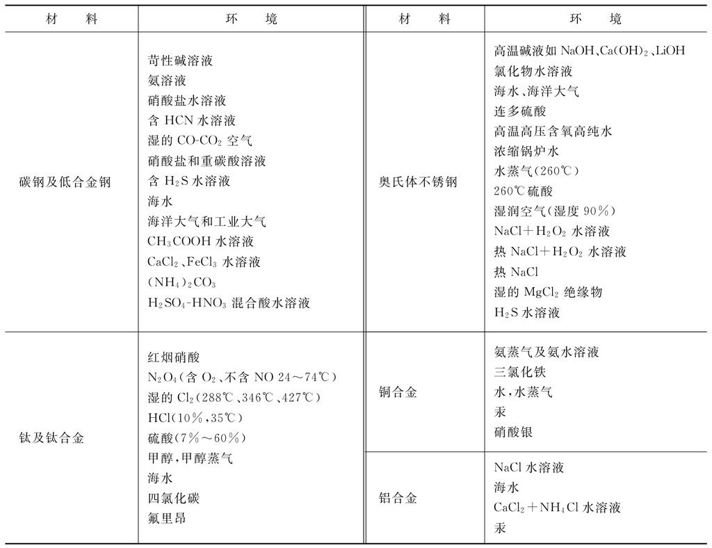 表1 易產(chǎn)生應(yīng)力腐蝕開裂的金屬材料和腐蝕環(huán)境組合(選自SH 3059附錄E)