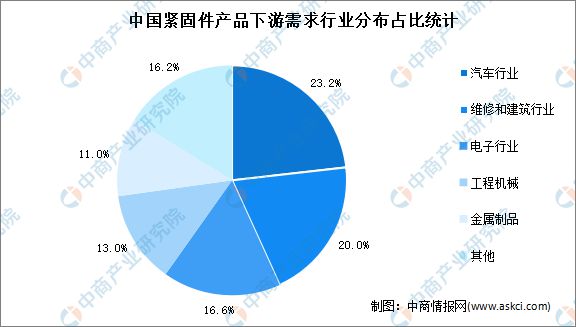緊固件素有“工業之米”之稱,被廣泛應用于工業經濟各領域。從緊固件產品下游需求行業來看,目前緊固件主要用于汽車行業、維修和建筑行業、電子行業、工程機械等。其中,汽車行業是最大的用戶,需求量約占緊固件總銷量的23.2%;其次是維修和建筑行業,占比20%;第三是電子行業,占比16.6%;第四是工程機械,占比13%。除此之外,航空航天領域緊固件用量較少,但產品附加值較高,是較為重要的細分應用領域。